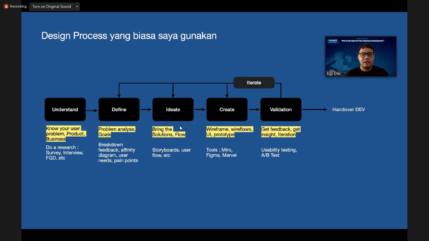 Lebih lanjut, desain UX sendiri dideskripsikan sebagai rencana untuk membuat sesuatu yang memiliki manfaat bagi orang lain. Terdapat beberapa langkah yang harus diselesaikan untuk membuat desain UX yang efektif, dimulai dari tahap understand. “Kita harus tahu usernya siapa dan masalah yang dialami apa supaya bisa menentukan apa produk yang akan dihasilkan,” jelas pria berkacamata itu.