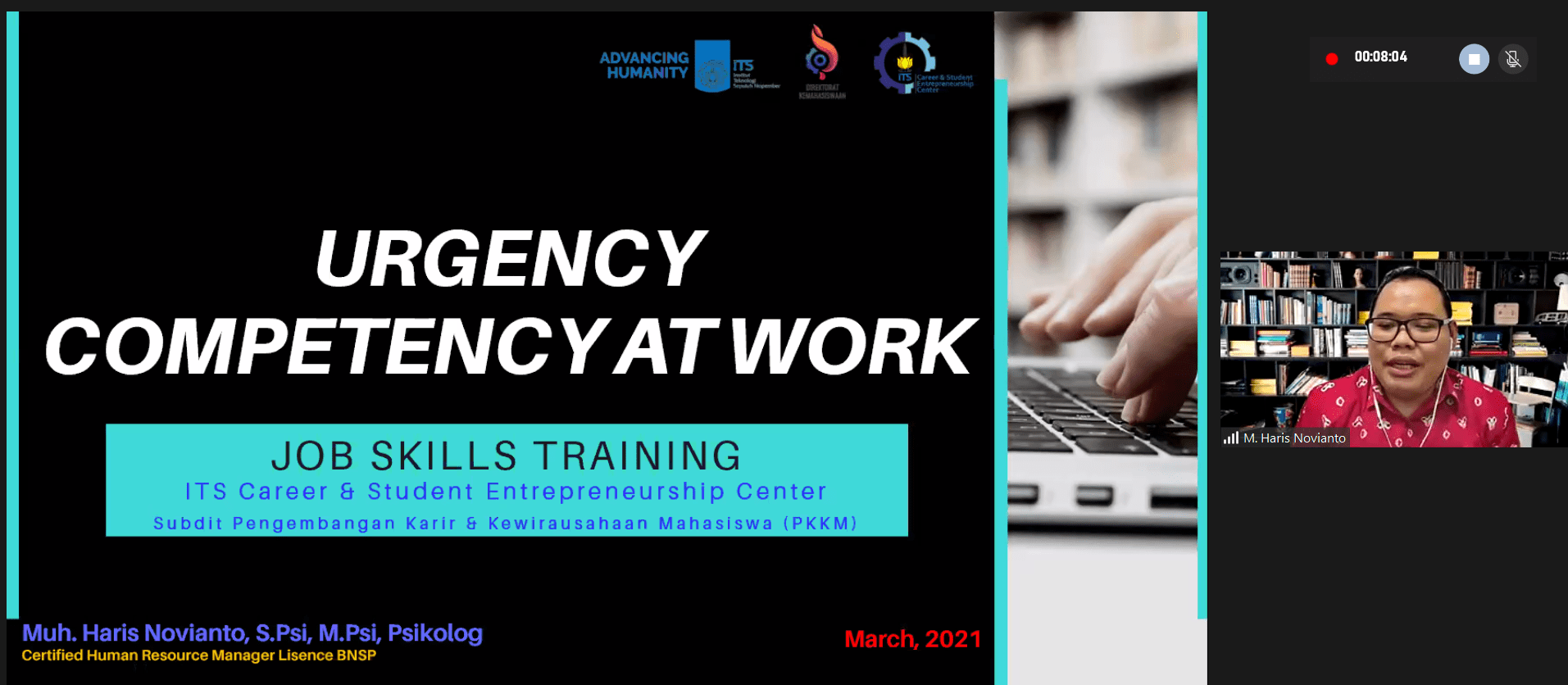 Muh Haris Novianto SPsi MPsi saat memaparkan materi pentingnya kompetensi dalam dunia kerja dalam webinar Job Skill Training bertajuk Urgency Competencies at Work, Kamis (25/3)