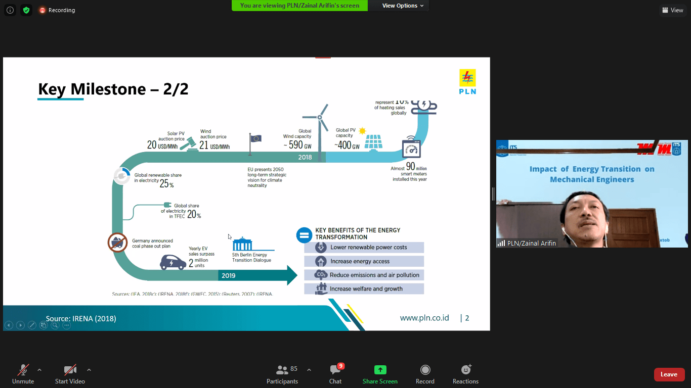 Wakil Presiden Pengembangan dan Standardisasi Teknologi PT Perusahaan Listrik Negara (PLN), Dr Zainal Arifin menjelaskan bahwa transisi energi adalah proses perubahan pola bagaimana energi diolah untuk kemudian dimanfaatkan, yang mana saat ini energi bahan bakar fosil mulai digantikan oeh energi terbarukan. “Kita bisa melihat key milestone transisi energi bermula dari Kyoto Protocol di tahun 1997,” paparnya.
