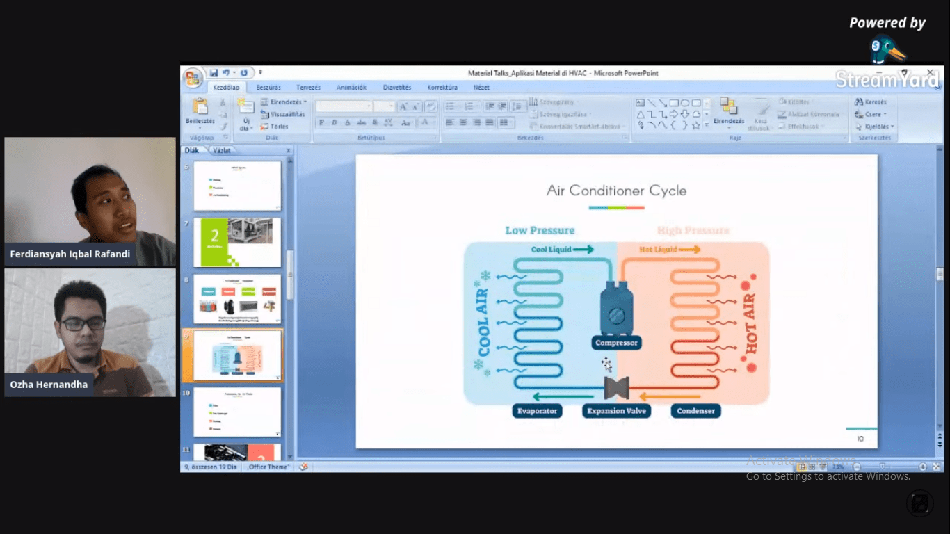 Pembicara dalam acara ini, Ferdiansyah Iqbal Rafandi mengatakan bahwa salah satu jenis HVAC adalah alat pemanas. Alat ini banyak digunakan di negara bermusim dingin atau salju. Ia menjabarkan, komponen utama dalam penyusunan alat ini ialah material yang memiliki tingkat konduktivitas thermal mumpuni seperti tembaga, aluminium, stainless steel, dan sebagainya. “Di samping itu, alat ini juga memerlukan material penyusun yang terbilang kuat,” sebut Iqbal.
