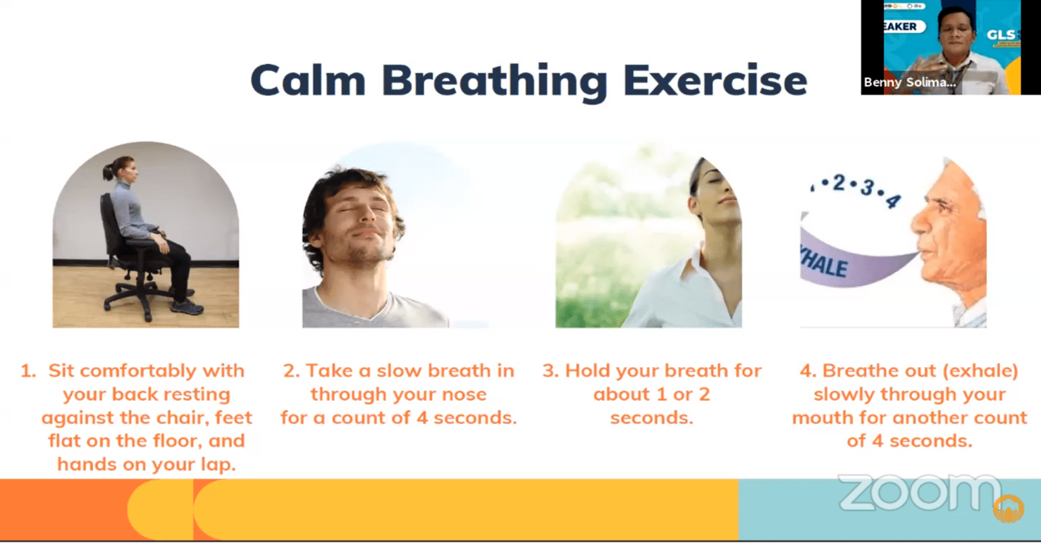 Dr Benny Soliman RGC LPT RPM memperagakan latihan pernapasan untuk menetralkan stres.