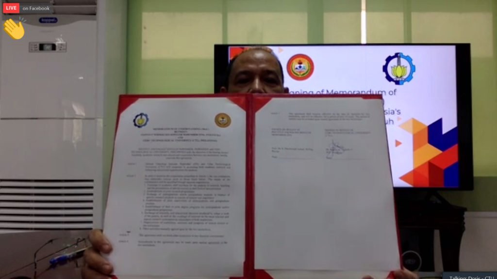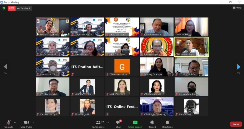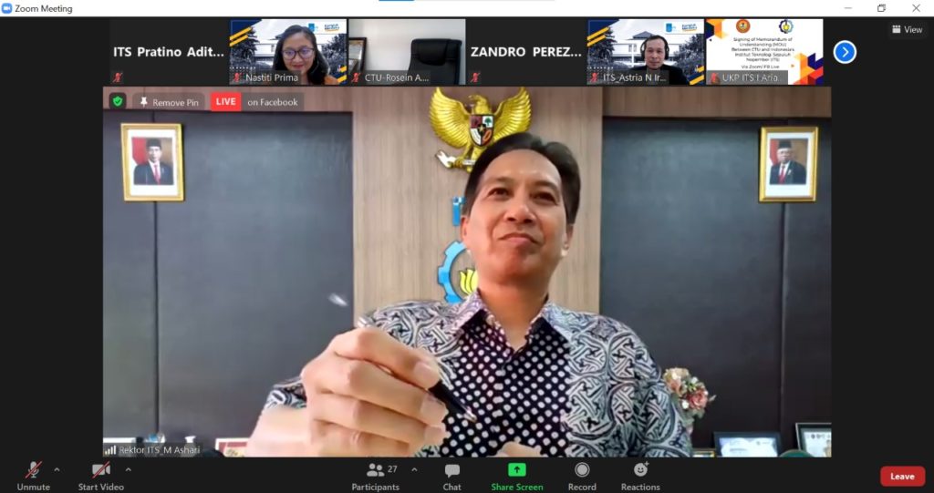 ITS Kampus, ITS News – Institut Teknologi Sepuluh Nopember (ITS) terus berupaya meningkatkan kerja sama di kancah internasional. Kali ini, dilakukan melalui penandatanganan nota kesepahaman atau Memorandum of Understanding (MoU) dengan Cebu Technological University (CTU) dari Filipina, yang diselenggarakan secara virtual, Kamis (15/4).