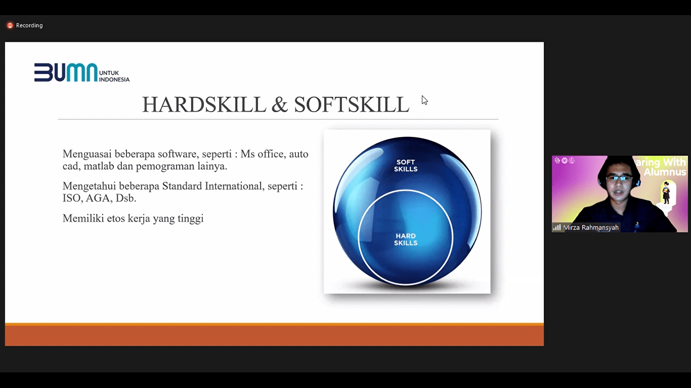 Tak lupa, ia menjelaskan bahwa hard-skill dan soft-skill sangatlah diperhatikan oleh perusahaan. Keahlian pelamar ini bisa diperkuat melalui sertifikat-sertifikat yang didapat dari training, workshop, conference, dan masih banyak lagi. “Sertifikat-sertifikat tersebut menjadi bukti berharga yang dapat menjual skill kita ke perusahaan khususnya BUMN,” terangnya dalam webinar bertajuk Bekal Awal Persiapan Menghadapi Persaingan Perusahaan BUMN ini.