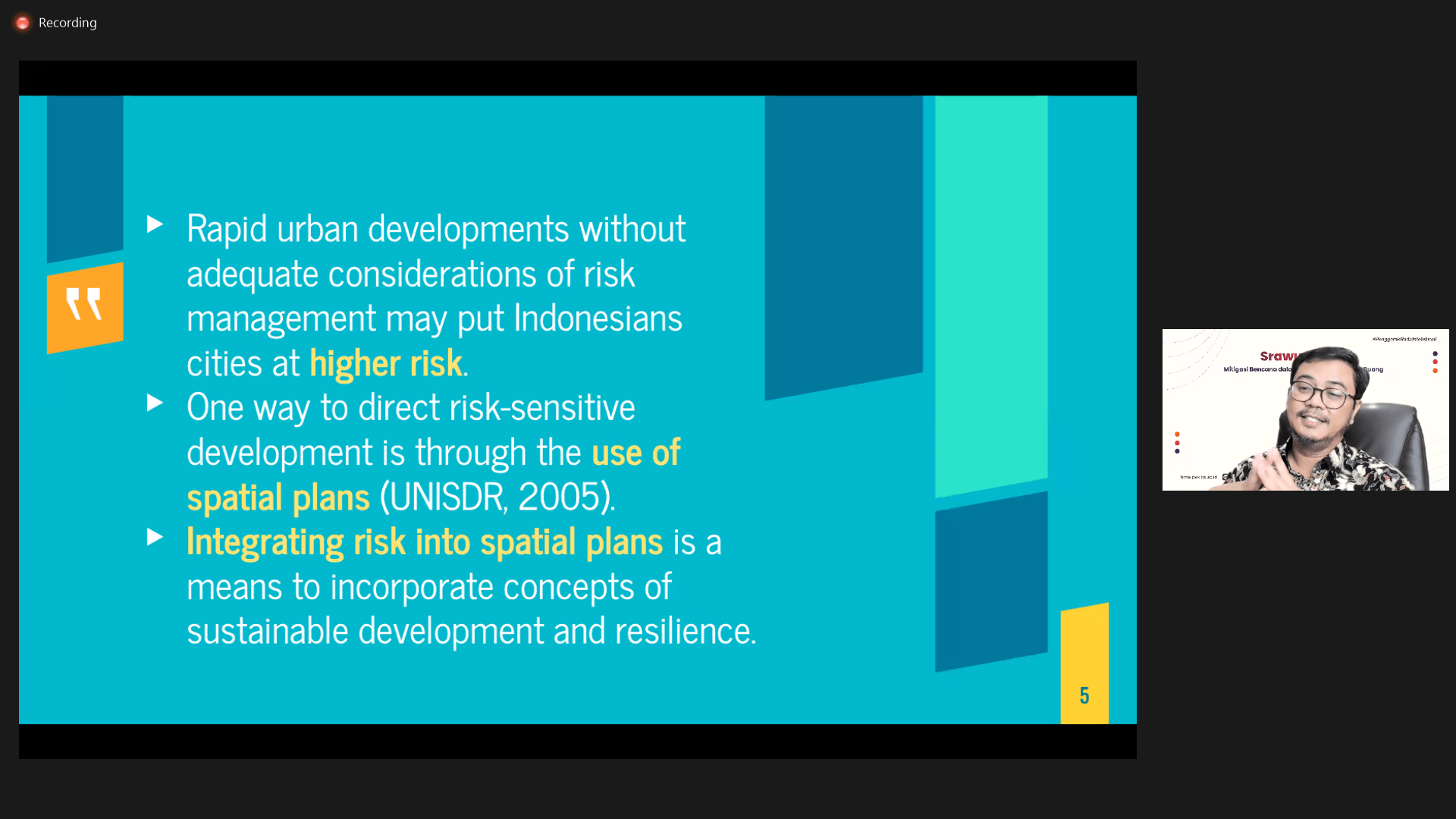 Kepala Pusat Penelitian Mitigasi Kebencanaan dan Perubahan Iklim Institut Teknologi Sepuluh Nopember (MKPI ITS), Adjie Pamungkas ST MDevPlg PhD memaparkan gagasannya mengenai pengintegrasian Disaster Risk Management ke dalam dokumen perencanaan tata ruang