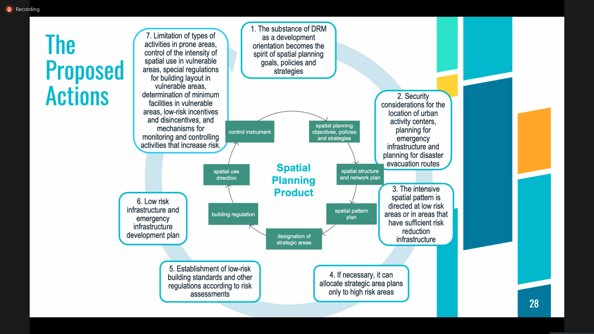 Menimbang hal tersebut, Adjie menyampaikan sebuah gagasannya berupa konsep untuk integrasi Disaster Risk Management atau manajemen risiko bencana ke dalam dokumen perencanaan tata ruang kota. Untuk mewujudkan hal tersebut, Adjie menguraikan, pertama-tama sebagai pelaku utama, seorang perencana tata ruang perlu memahami sejarah kebencanaan serta mengumpulkan data yang berkaitan dengan penilaian risiko bencana di daerah perencanaannya.