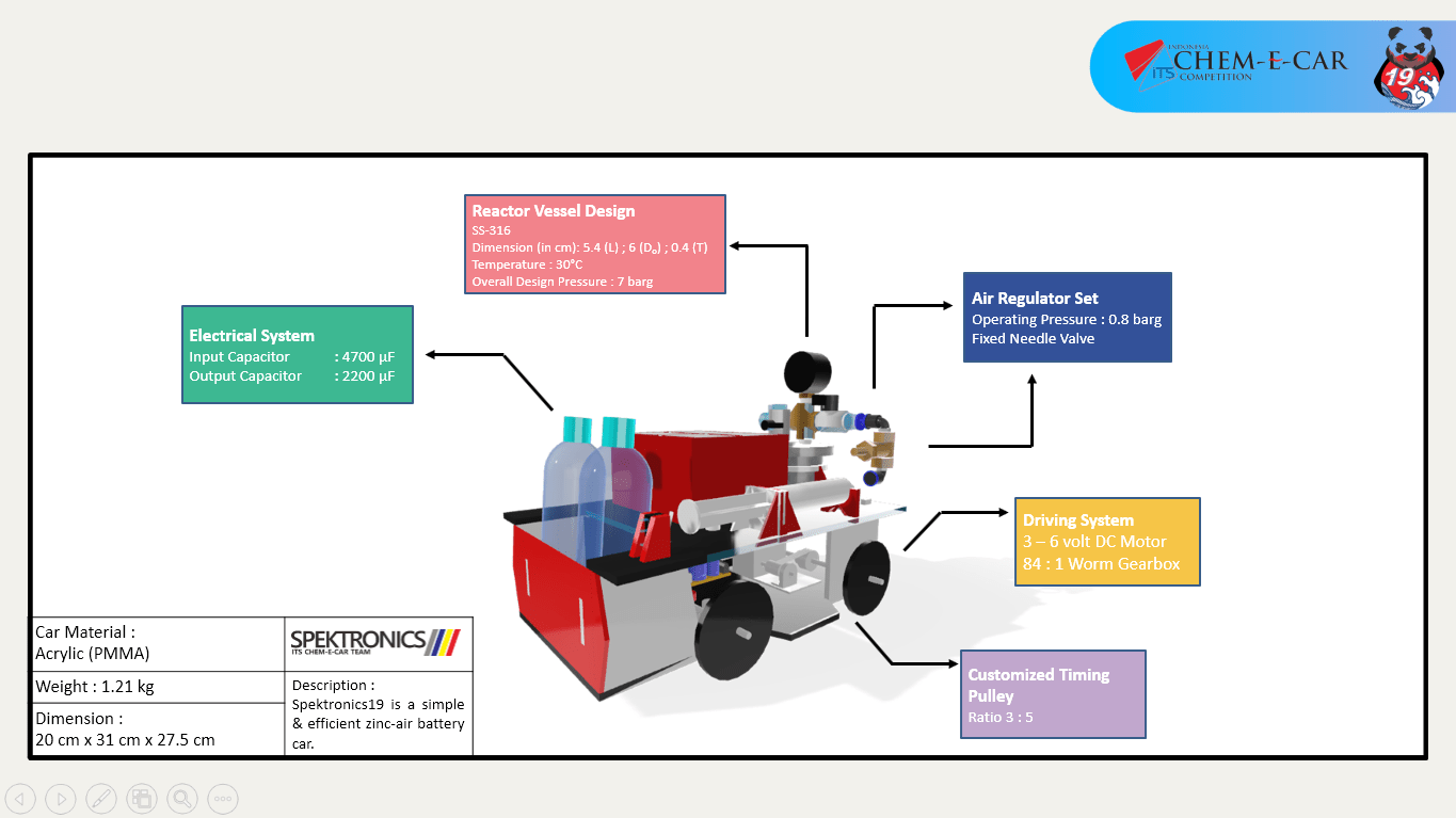 Sempat mengalami kesulitan untuk mendapat bahan manufaktur dari luar negeri, tim yang menyelesaikan pembuatan purwarupa mobil dalam waktu satu bulan ini tak patah semangat. Benar saja, kategori best presentation pun berhasil diraihnya dalam kompetisi Indonesia Chem-E-Car Competition (ICECC) 2021. “Kami berharap sumber daya prototipe ini bisa dikembangkan menjadi sel bahan bakar atau fuel cell tersendiri,” harapnya menutup.