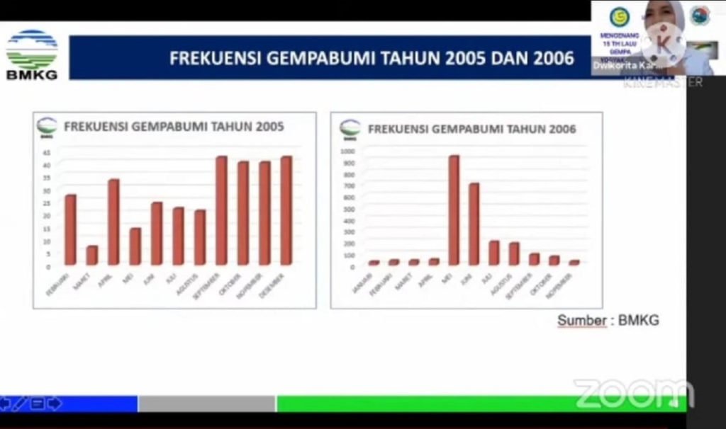 Grafik katalog gempa bumi tahun 2005 dan 2006, rekaman kejadian gempa di waktu yang berdekatan dengan terjadinya gempa besar di Jogja pada 27 Mei 2005 yang pernah dijelaskan oleh Kepala BMKG Dwikorita Karnawati