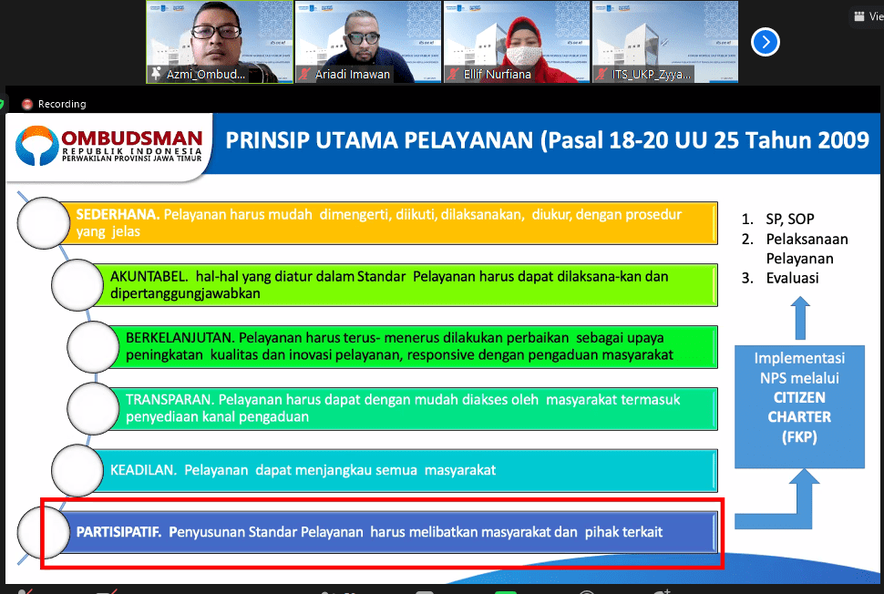 Kampus ITS, ITS News – Kebijakan mengenai unit penyedia layanan publik telah diatur dalam Undang-Undang No. 25 Tahun 2009. Meski demikian, dalam praktiknya sendiri, banyak hal yang perlu diperhatikan dengan baik. Menggarisbawahi hal ini, Ombudsman Republik Indonesia (RI) Provinsi Jawa Timur (Jatim) menjabarkan peran dan posisi masyarakat dalam penyediaan layanan publik di Indonesia.