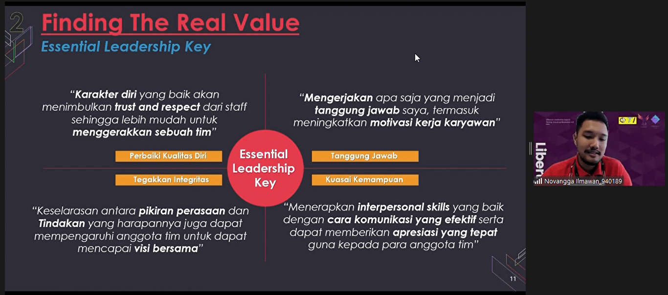 Lebih dalam, Angga menyampaikan esensi dari leadership, yaitu sebagai perbaikan kualitas diri, tanggung jawab terhadap tugasnya, dan peningkatan motivasi kepada orang yang dipimpinnya. Selain itu pemimpin juga dituntut untuk menguasai dan menerapkan keterampilan dengan baik, serta menegakkan integritas.
