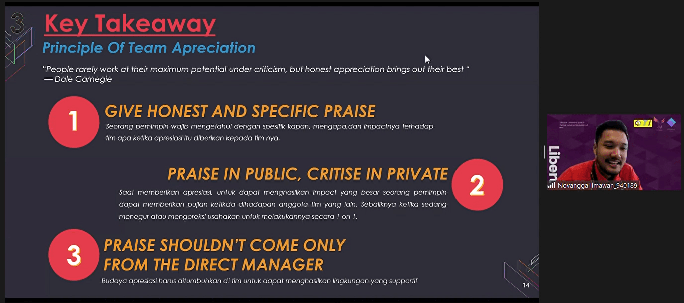 Lebih lanjut, pria asal Gresik ini menuturkan pentingnya seorang leader dalam tim untuk mampu memberikan apresiasi kepada anggotanya. Ketika pekerjaan seseorang dapat dihargai, impact bagi individu dan tim akan sangat luar biasa. “Beri pujian yang baik di depan namun berilah kritikan secara personal,” tambahnya.