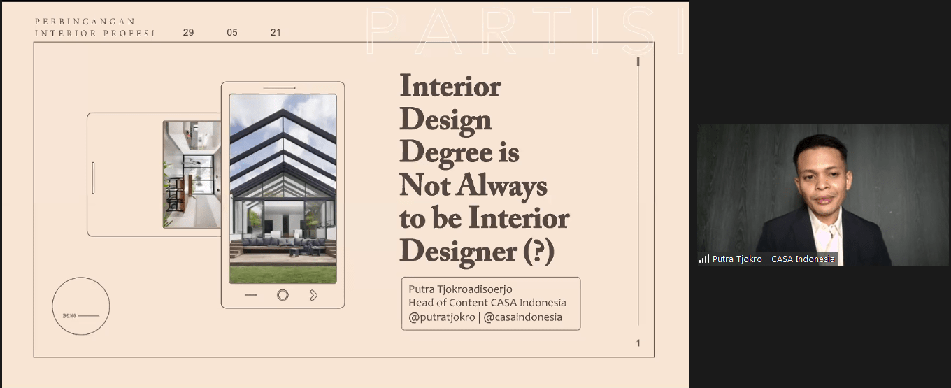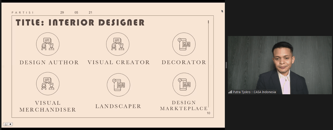 Enam profesi yang mengejar mahasiswa desain interior dan rumpunnya sedang dijelaskan oleh Putra