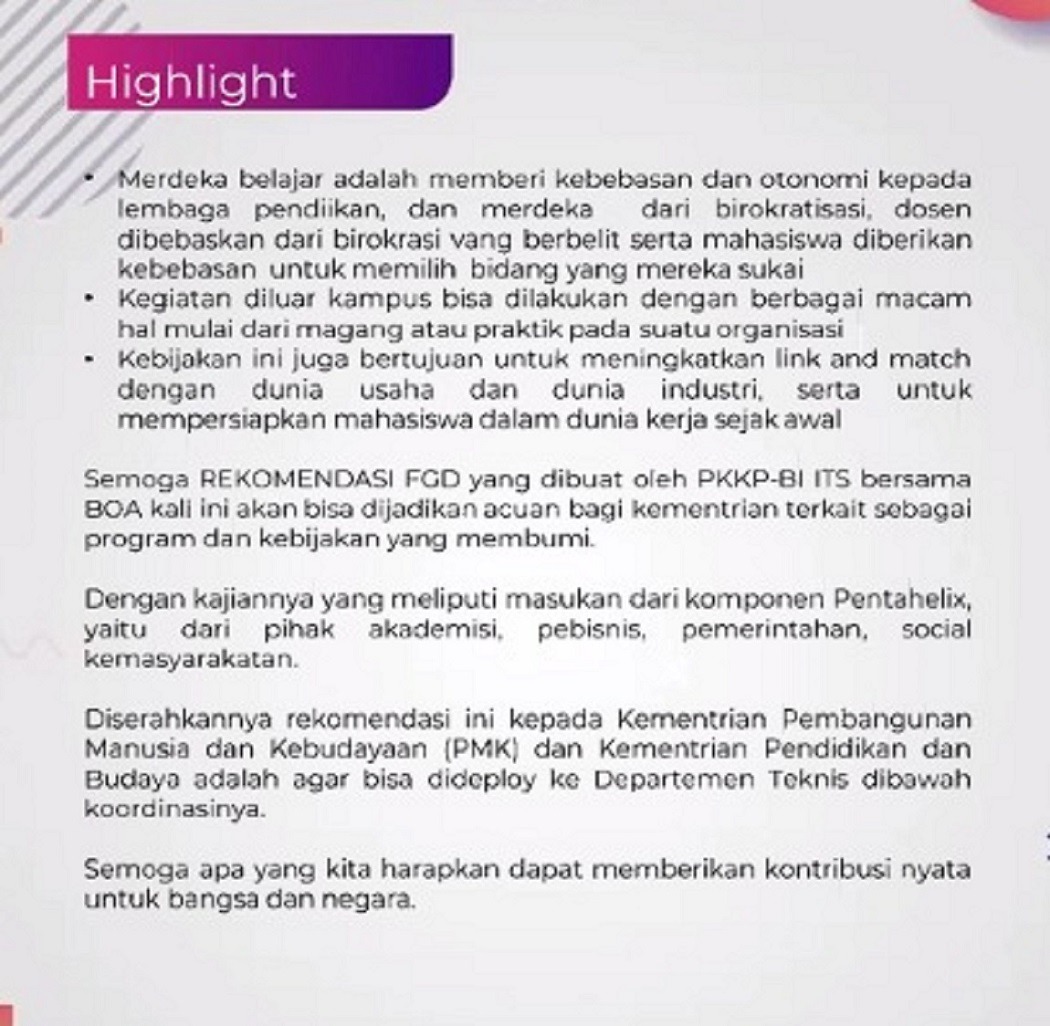 Nilai-nilai penting yang terdapat dalam rekomendasi kebijakan dengan tema Kampus Merdeka Speed Up ABGS++