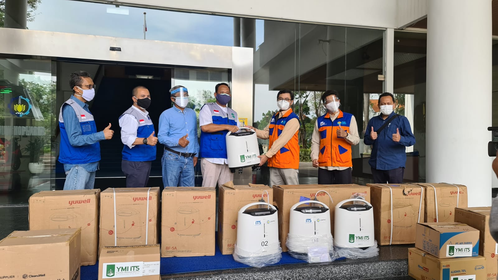 Serah Terima Oksigen Konsentrator, Obat-Obatan, dan Vitamin oleh Ketua YMI ITS Ir Triyanto (empat dari kiri) kepada Ketua Satgas Covid-19 Adjie Pamungkas ST MDevPlg PhD (tiga dari kanan)
