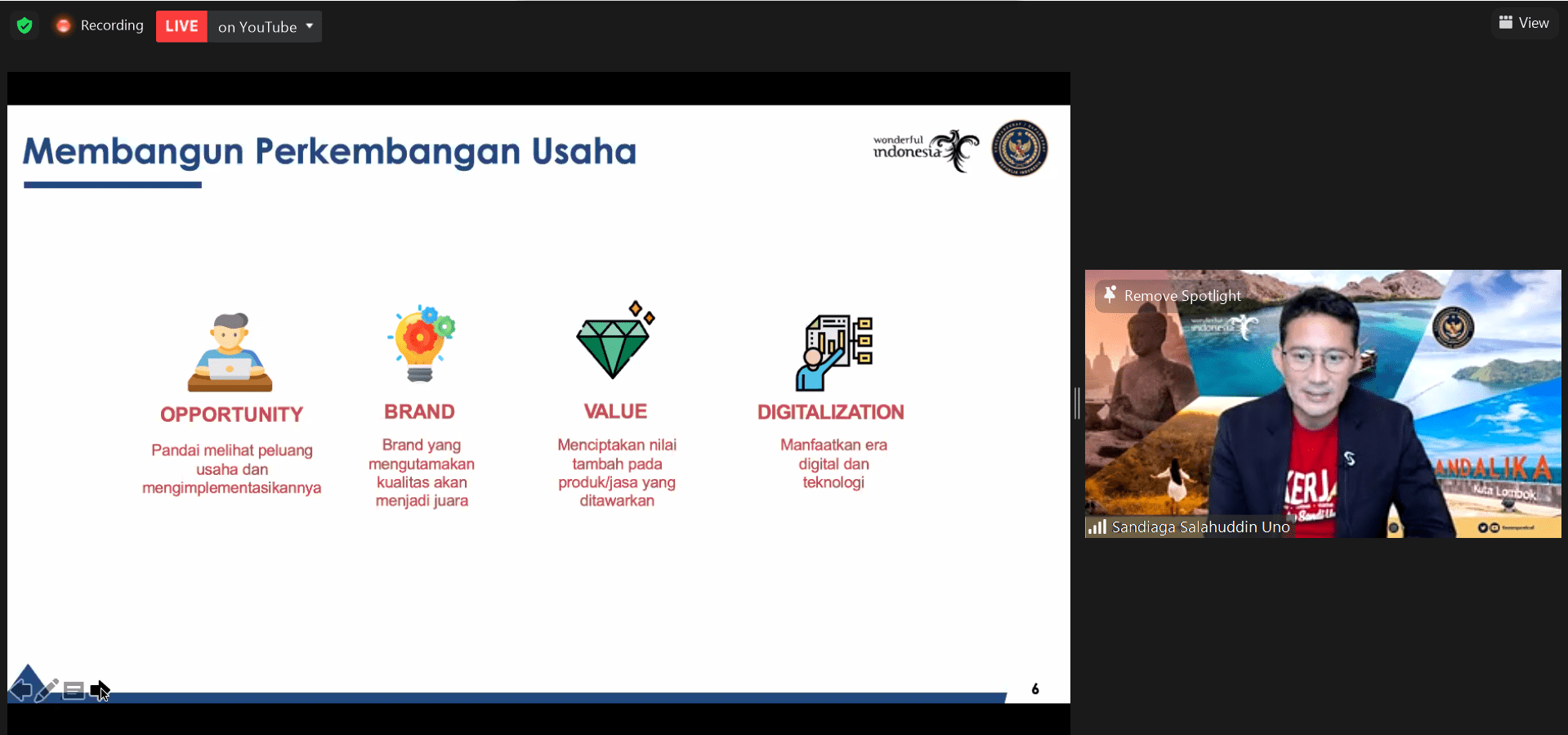 Dr Sandiaga Salahuddin Uno membagikan materi mengenai membangun perkembangan usaha
