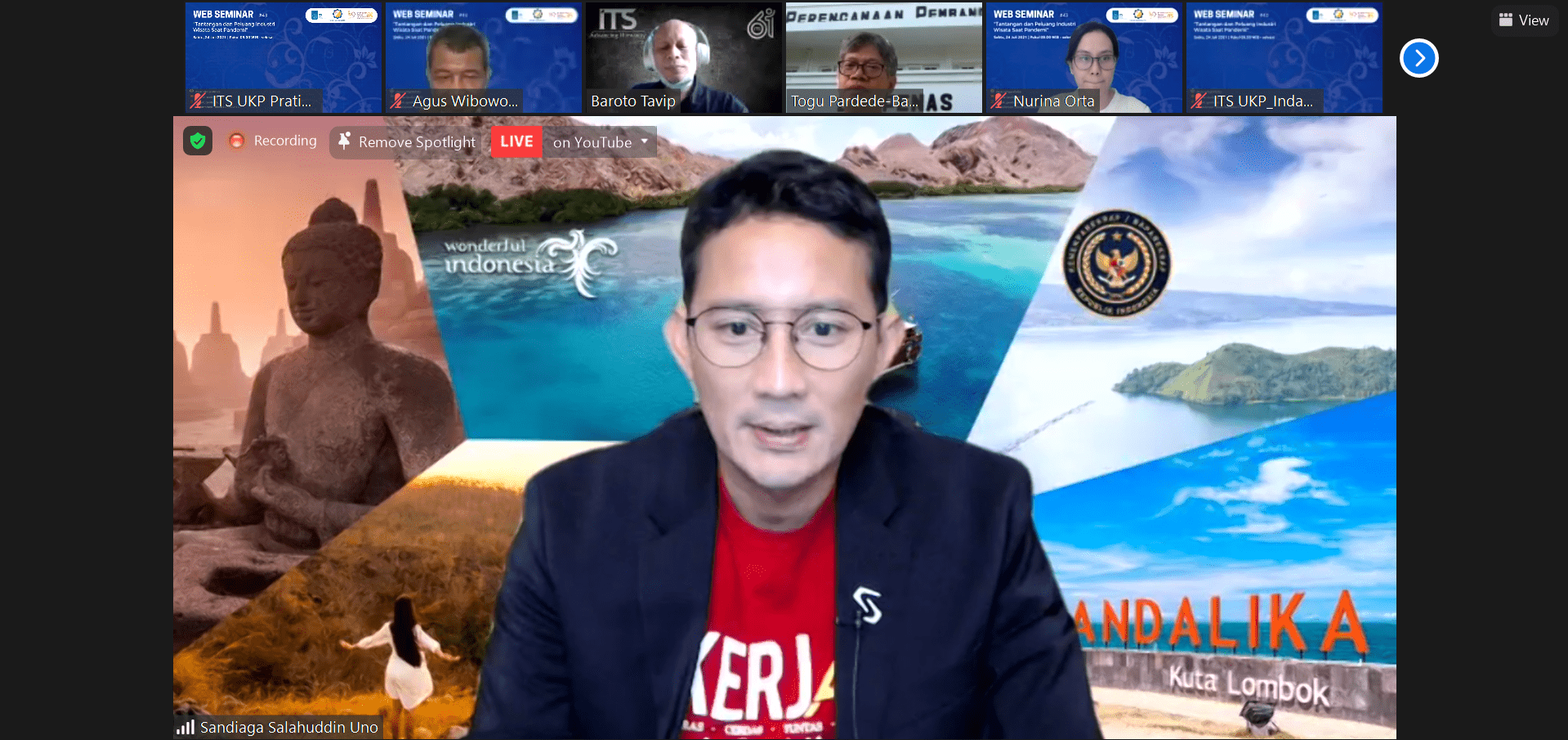 Kampus ITS, ITS News – Sektor pariwisata dan ekonomi kreatif (Parekraf) merupakan salah satu lini yang terdampak pandemi Covid-19 secara signifikan. Meski demikian, dalam seminarnya bersama Institut Teknologi Sepuluh Nopember (ITS), Menteri Parekraf Dr Sandiaga Salahuddin Uno BBA MBA menerangkan bahwa industri Parekraf memegang peran penting dalam memulihkan kondisi pasca pandemi.
