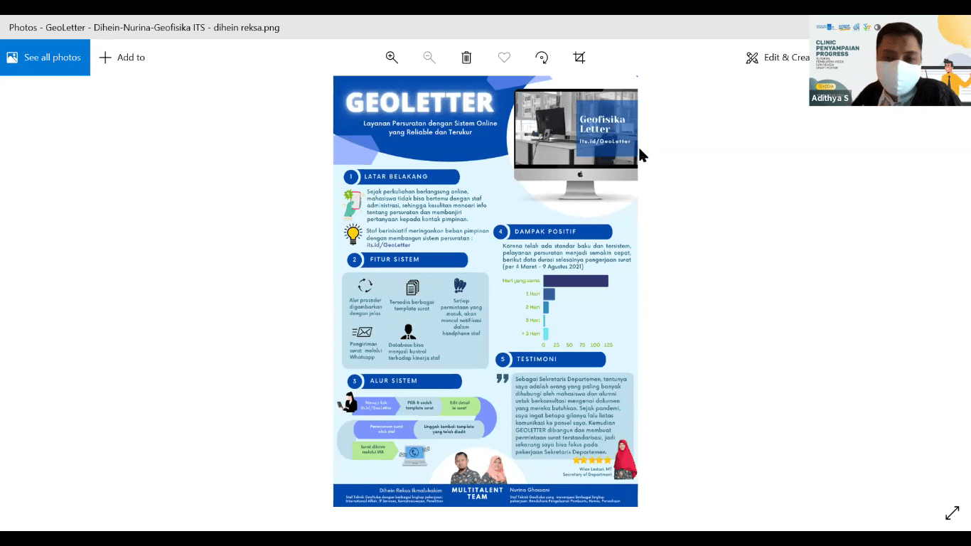 Dalam tahapan yang baru saja diselenggarakan pada Kamis, (12/8) ini, Adith hadir secara langsung untuk memandu para peserta Tex2Dia. Adith memberikan dua contoh poster, yang sudah cukup baik menurutnya dari salah satu peserta dan satu poster yang masih perlu banyak pembenahan, sebagai bahan untuk memandu tiap peserta. “Semua peserta bisa berkreasi sesuai dengan kemampuan tim itu masing-masing,” ungkapnya.