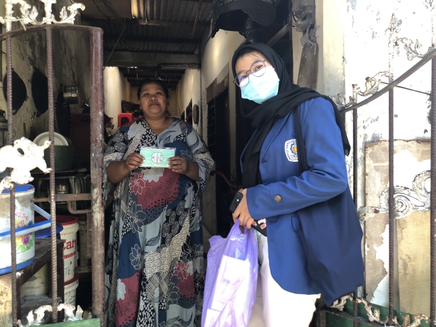Potret salah satu mahasiswa dari Tim KKN ITS saat memberikan bantuan masker kepada masyarakat Dusun Kalisari.