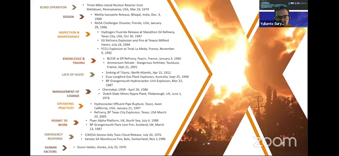 Dalam webinar berjudul “How Can University Contribute To The Process Safety Management (PSM) Implementation”, Fahrudin mengingatkan ada banyak insiden terjadi di industri bahan kimia yang telah dilaporkan selama beberapa tahun ke belakang. Sekaligus tak menutup kemungkinan, ke depan akan ada potensi untuk pelepasan bahan kimia berbahaya secara tidak sengaja atau ketika tidak terkontrol dengan baik.