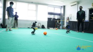 Robot Sepakbola Humanoid ICHIRO ketika sedang berlatih kerja sama antar robot