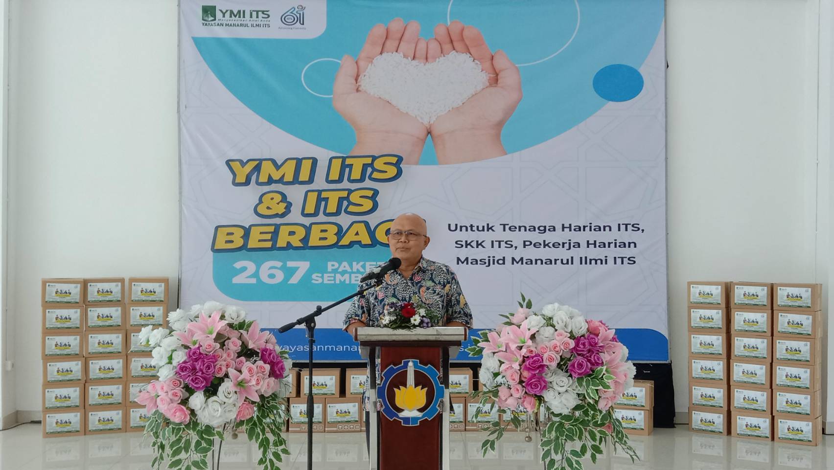 Wakil Rektor II ITS, Ir Mas Agus Mardyanto ME PhD, memberikan sambutan pembuka pada kegiatan berbagi sembako oleh YMI ITS