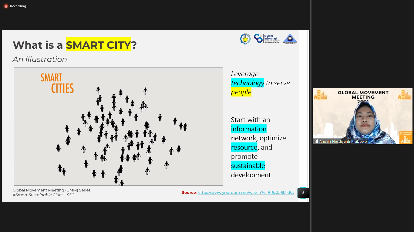 Ahli Smart City, Anisah Herdiyanti SKom MSc, menuturkan bahwa poin ‘smart city and communities’ yang tercantum dalam SDGs 11 berkaitan dengan sistem pengelolaan dan manajemen perkotaan, mulai dari pengelolaan sampah, air, dan banyak lainnya. “Sebenarnya ini berkutat pada bagaimana sebuah sistem bisa terintegrasi dengan sistem yang lain sehingga bisa mengatasi masalah di perkotaan,” jelasnya.