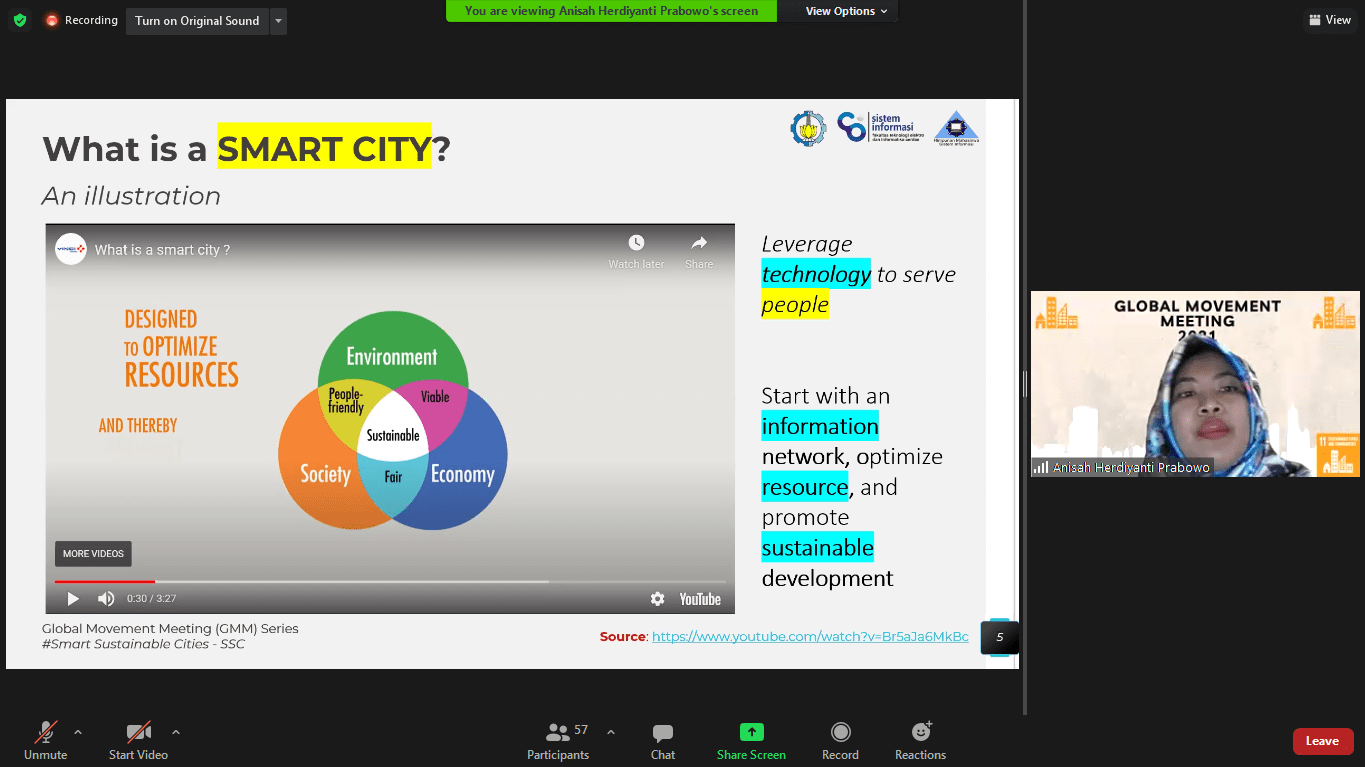 Anisah sedang memberi pengertian bahwasanya smart city terwujud atas partisipasi manusia di dalam sistem perkotaan yang ada