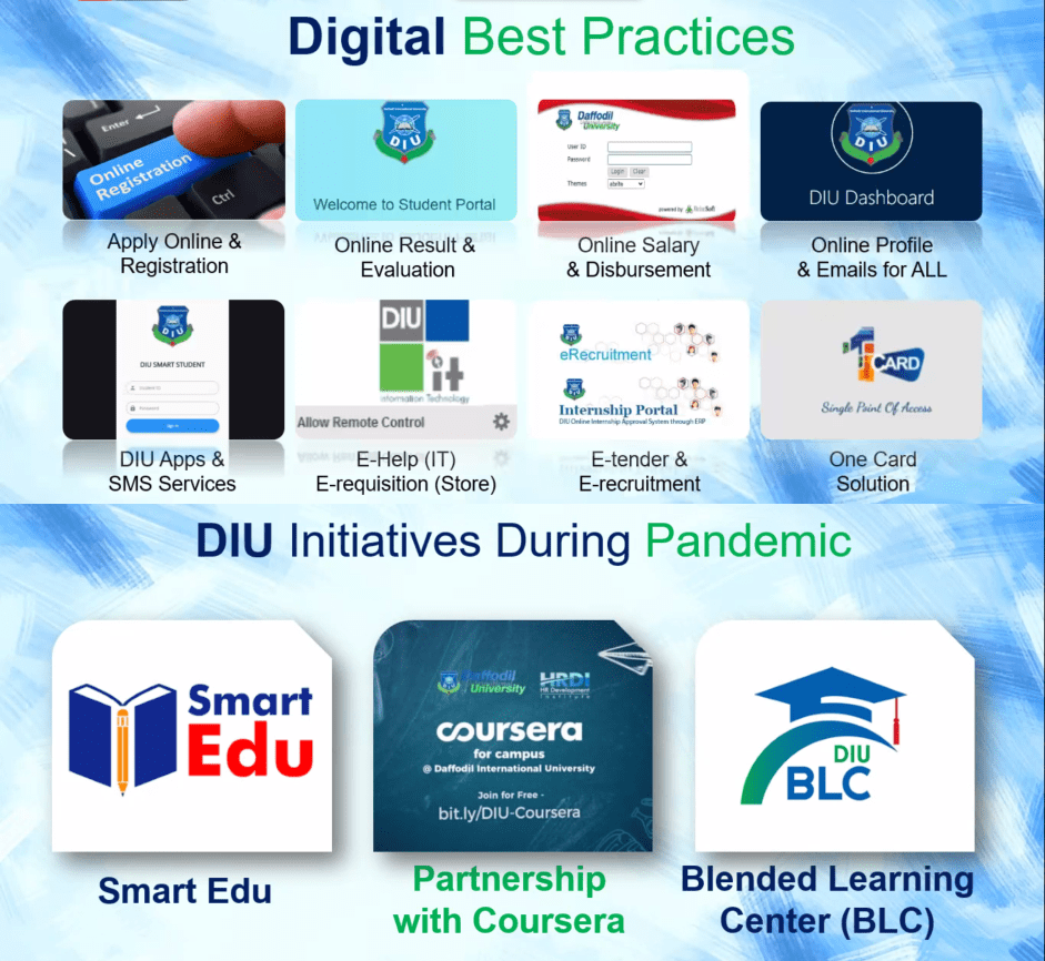 Beberapa inovasi digital yang dilakukan Daffodil International University di masa pandemi.