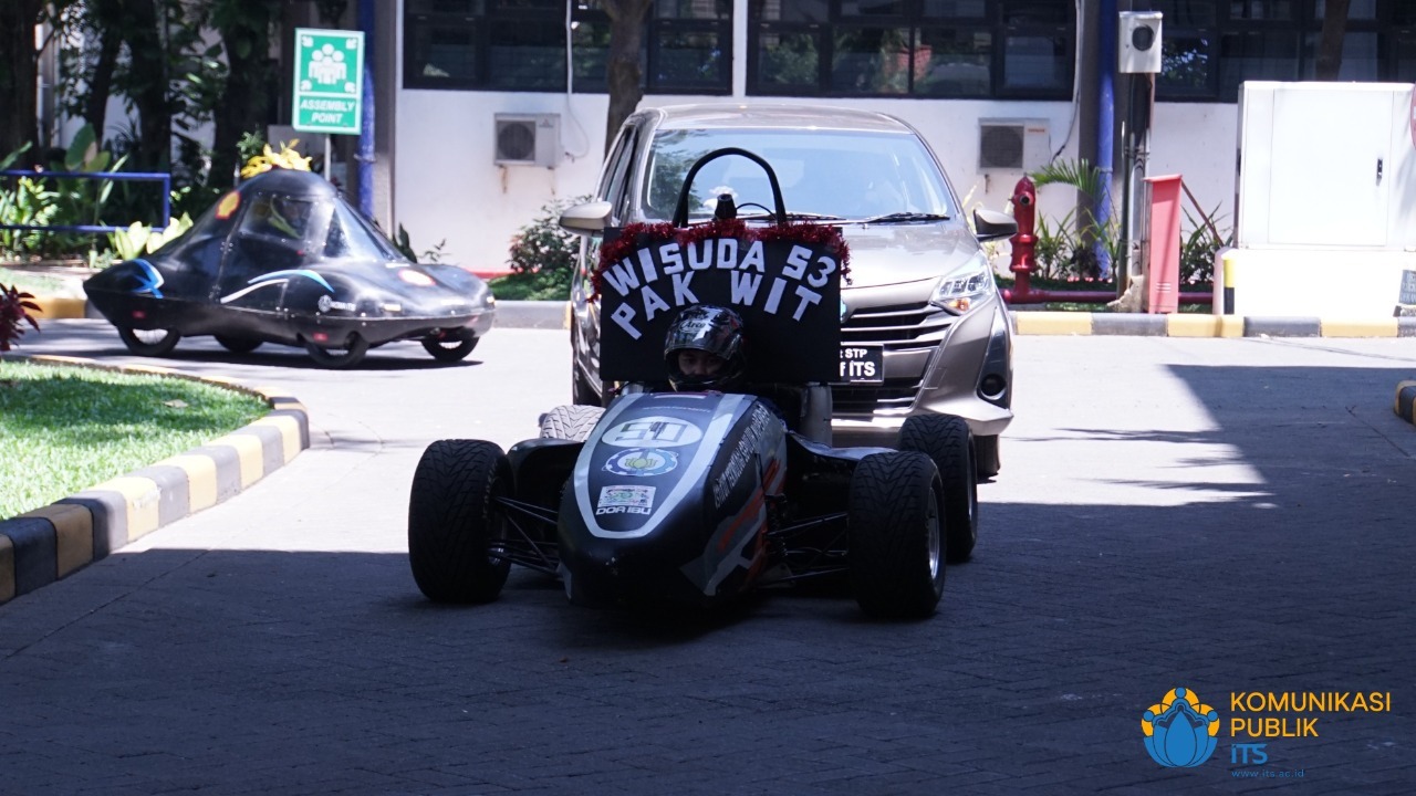 Mobil yang membawa wisudawan program doktor Teknik Mesin ITS, Dr Ir Witantyo MEngSc, saat menuju depan Gedung Rektorat ITS dengan iringan mobil Tim Sapuangin ITS