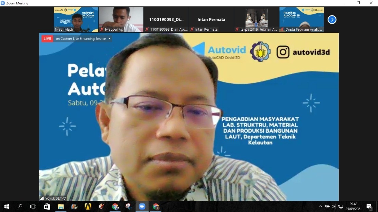 Ketua pelaksana AUTOVID, Yoyok Setyo Hadiwidodo ST MT PhD menyampaikan bahwa AUTOVID (AutoCAD COVID 3D) adalah sebuah media pelatihan AutoCAD 3D secara online untuk masyarakat terdampak Covid-19. Pelatihan ini dimulai sejak Sabtu (4/9) dan digelar satu minggu sekali di hari yang sama selama empat kali pertemuan. “Sebelumnya pelatihan serupa juga pernah diadakan di masa awal pandemi yaitu pelatihan AutoCAD 2D,” ujar dosen Departemen Teknik Kelautan ITS ini.