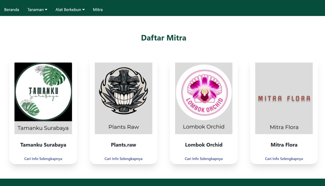 Halaman daftar mitra UMKM tanaman dan alat berkebun dalam website hasil Abmas ITS