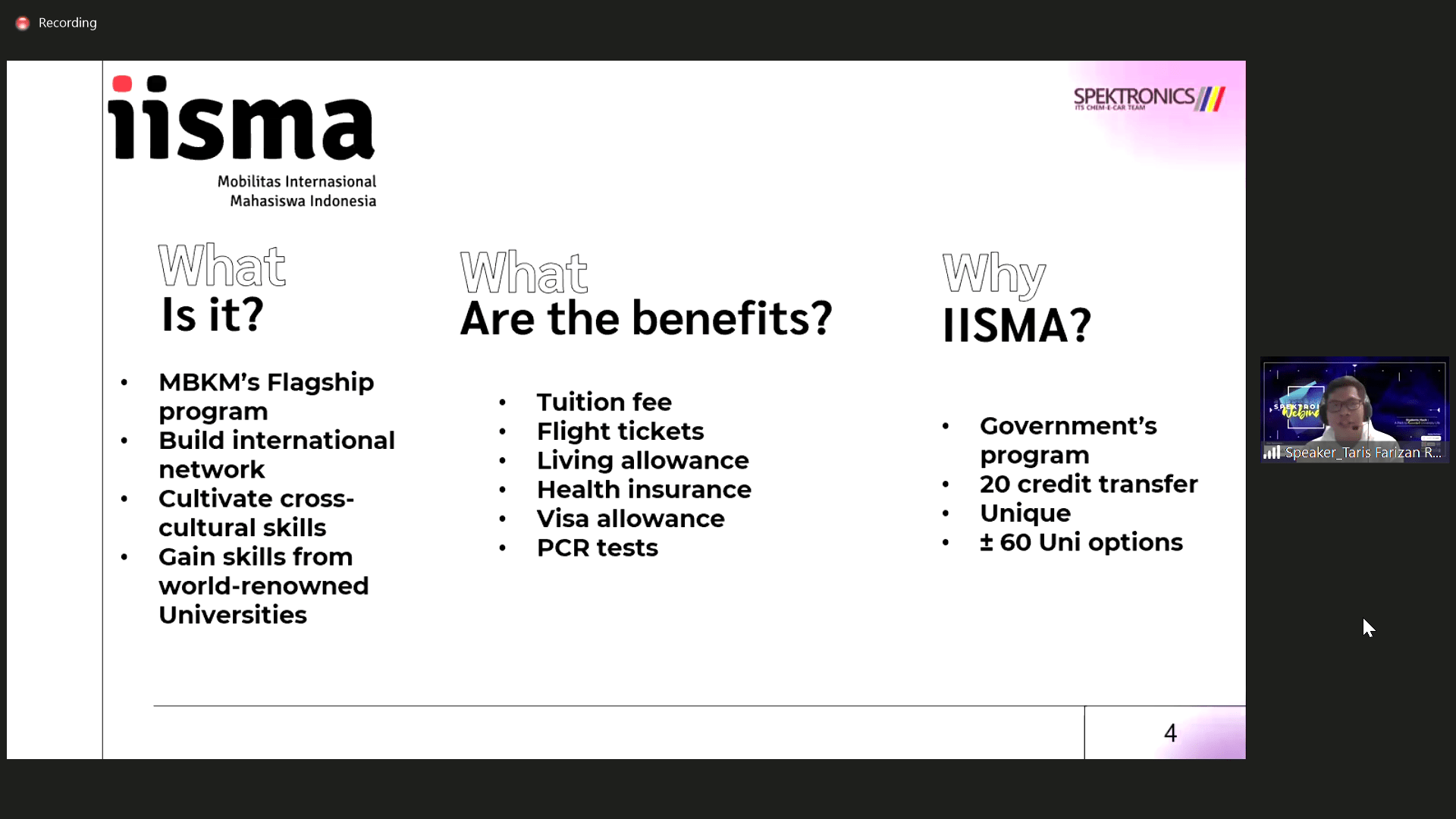 Taris Farizan Rochman saat membawakan materi international exposure dalam Webinar Spektronics 2021