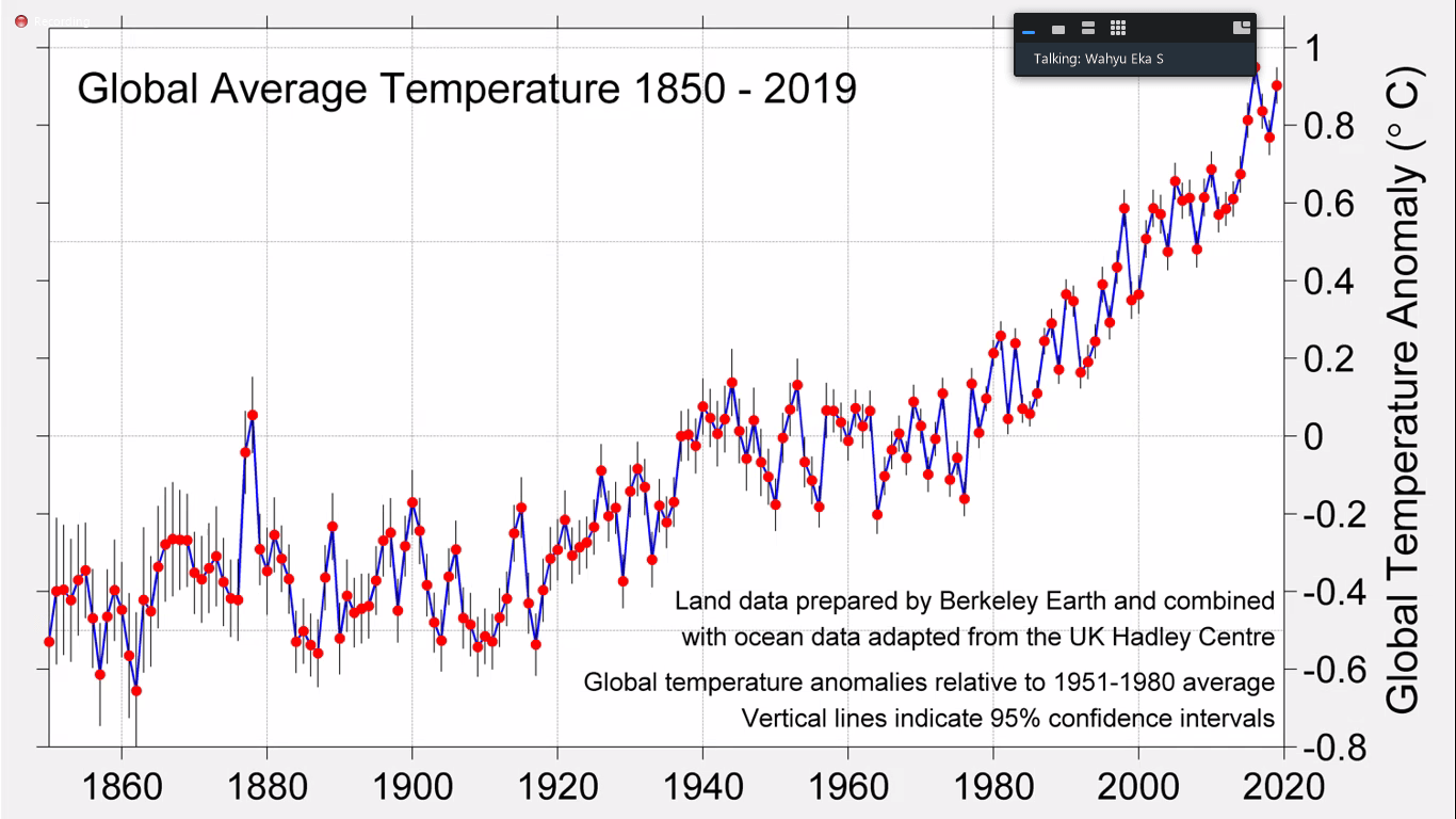 Wahyu Eka Setyawan, Manajer Kampanye WALHI Jawa Timur, menyebutkan kenaikan suhu rata-rata bumi sejak tahun 1850 s.d 2019 mencapai satu derajat celcius. Meski terdengar sedikit, namun dampak yang terasa sangat besar. Perubahan iklim ini menyebabkan banyak perubahan dalam berbagai sektor di kehidupan manusia.