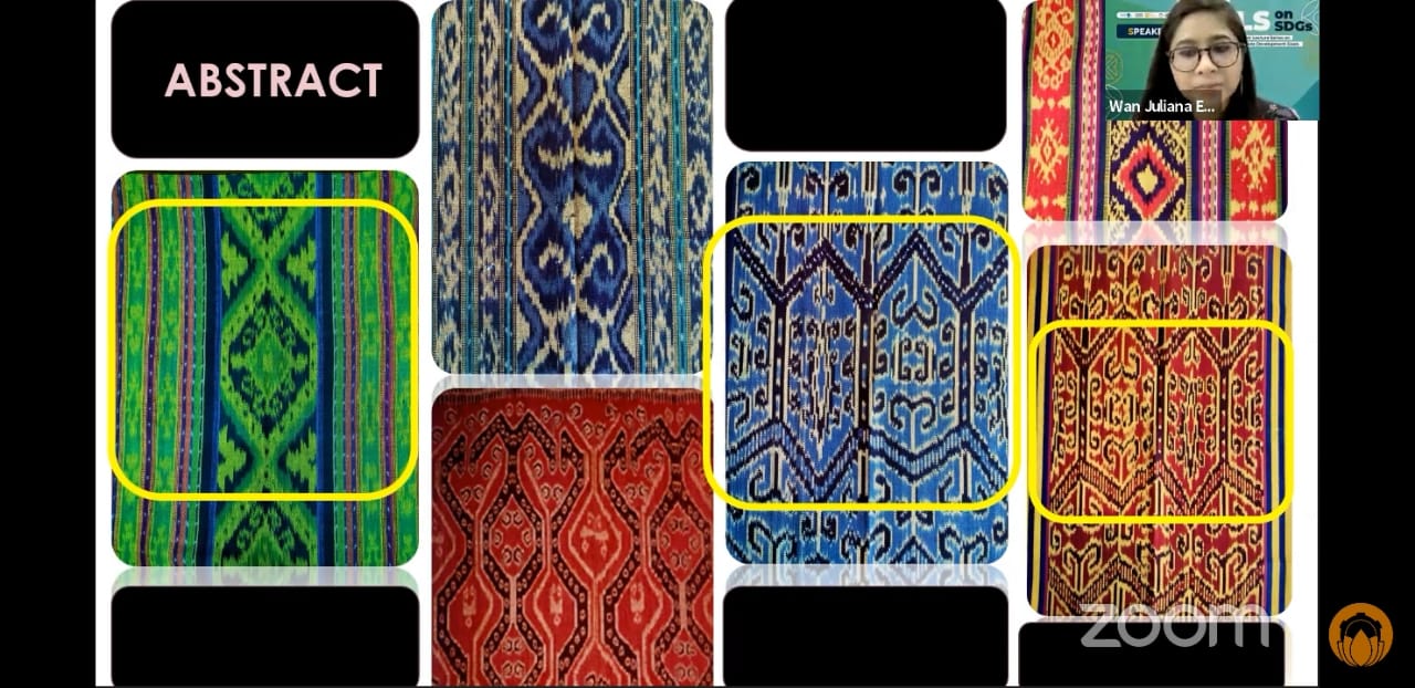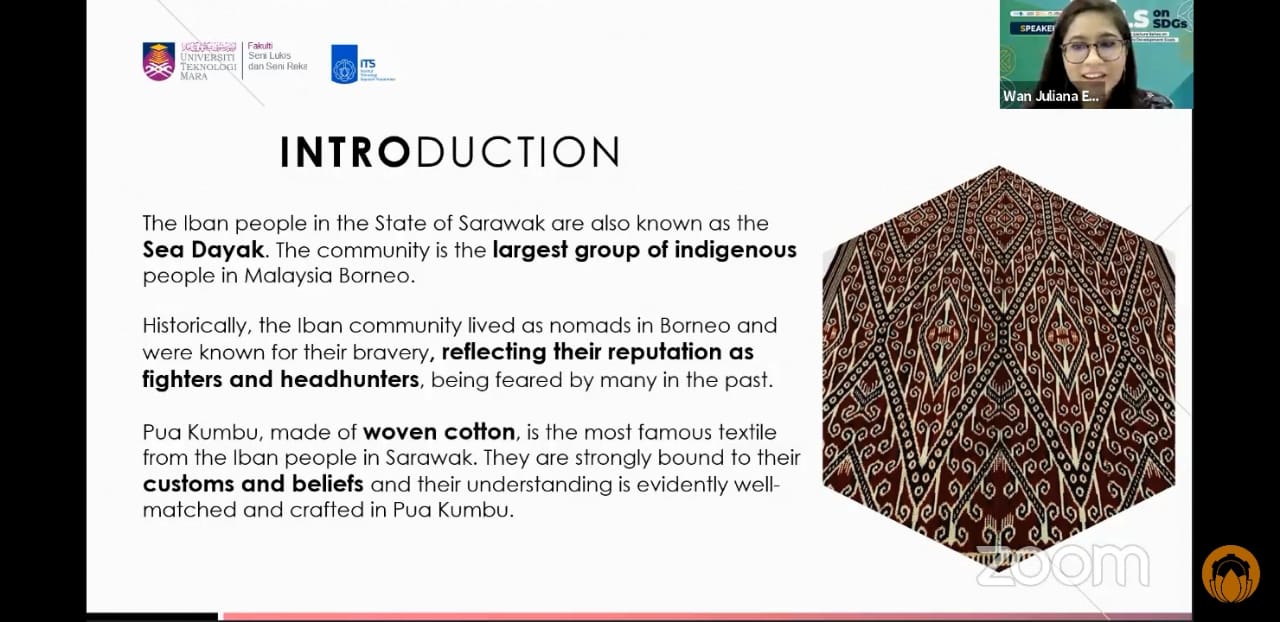Wan Juliana Emeih Wahid ketika memaparkan sejarah dari Pua Kumbu saat Guest Lecture Series on Sustainable Development Goals (GLS on SDGs), Selasa (5/10).