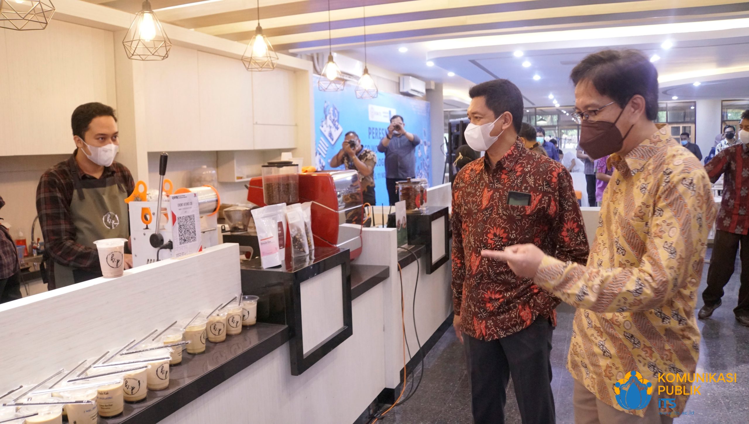 Rektor ITS, Prof Dr Ir Mochammad Ashari MEng (kanan), dan Wakil Rektor IV, Bambang Pramujati ST MSc Eng PhD (kiri), ketika mencoba kopi pada Co-Working Space ITS.