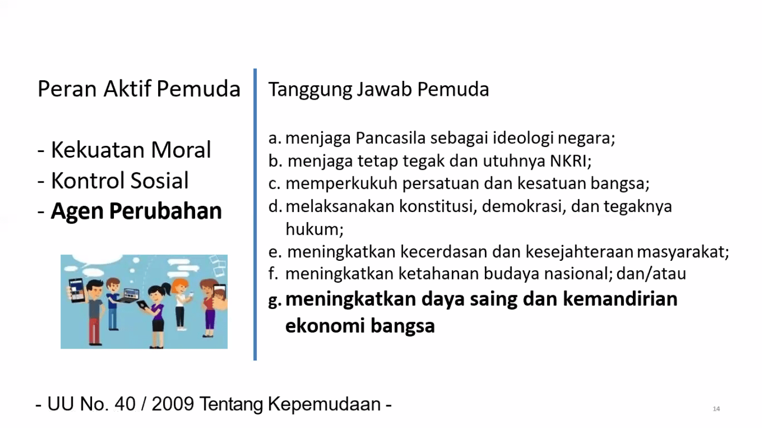 Peran aktif pemuda untuk mewujudkan kemandirian ekonomi bangsa seperti yang tertuang dalam UU No.40 Tahun 2009 Tentang Kepemudaan.