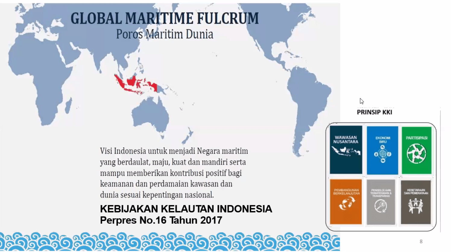 Visi Indonesia menjadi poros maritim dunia yang tertuang pada Perpres No.16 Tahun 2017 Tentang Kebijakan Laut Indonesia.