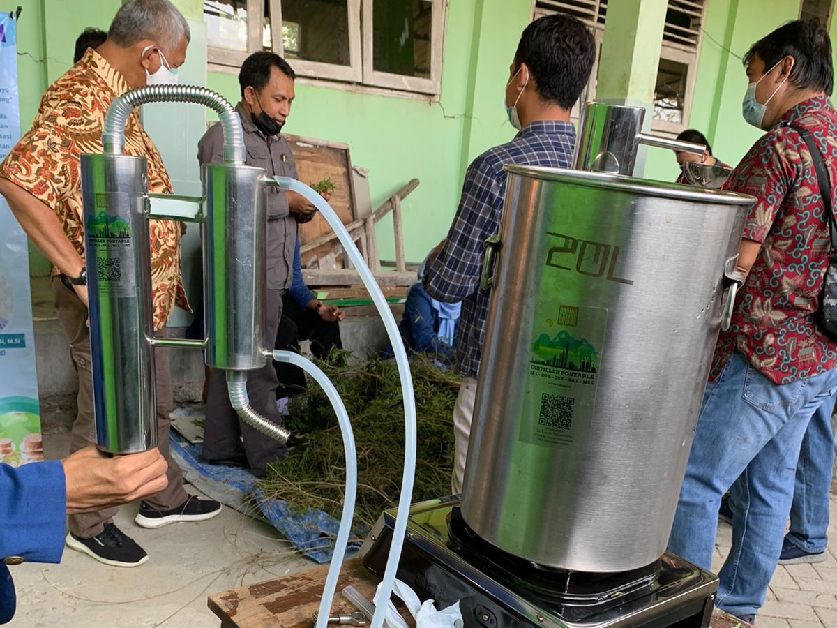 Proses destilasi dilakukan menggunakan destilator portabel yang dipanaskan dengan kompor gas dilakukan setelah proses pengeringan. Metode destilasi ini dipilih karena merupakan cara yang efektif, sederhana, dan mudah dilakukan oleh masyarakat setempat. “Dari proses destilasi ini akan dihasilkan minyak kayu putih yang selanjutnya akan didistribusikan ke pasar lokal,” paparnya.