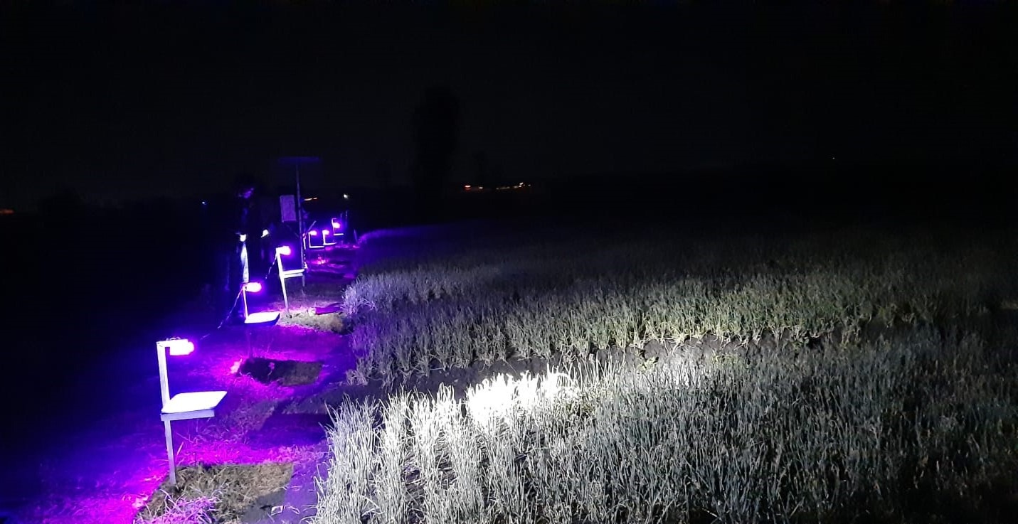 Penampakan alat pengendali hama berbasis lampu LED berbasis spektrum warna cahaya di malam hari