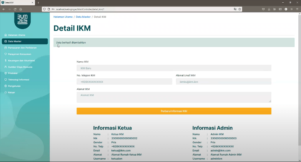 Tampilan Informasi detail IKM yang dikelola oleh Data Master atau pihak BUMDes untuk memantau IKM yang terdaftar di BUMDes.