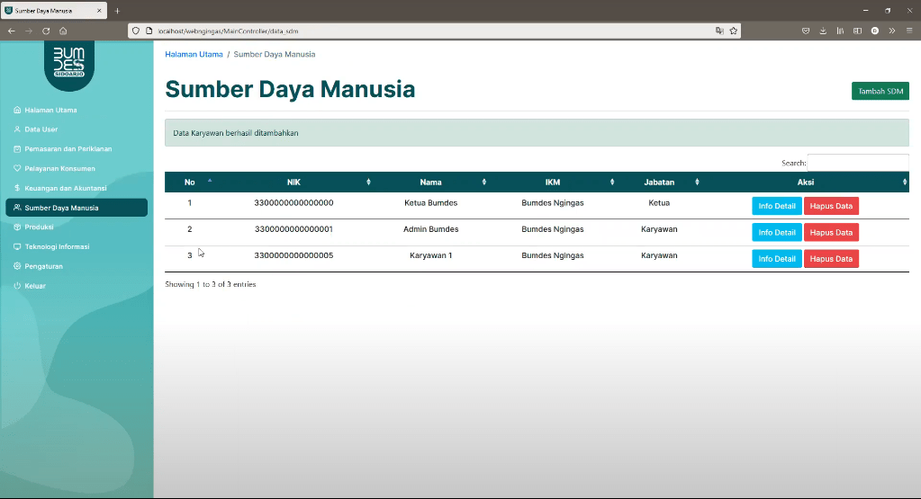 Tampilan Data Sumber Daya Manusia yang dikelola oleh Data User atau operator IKM.