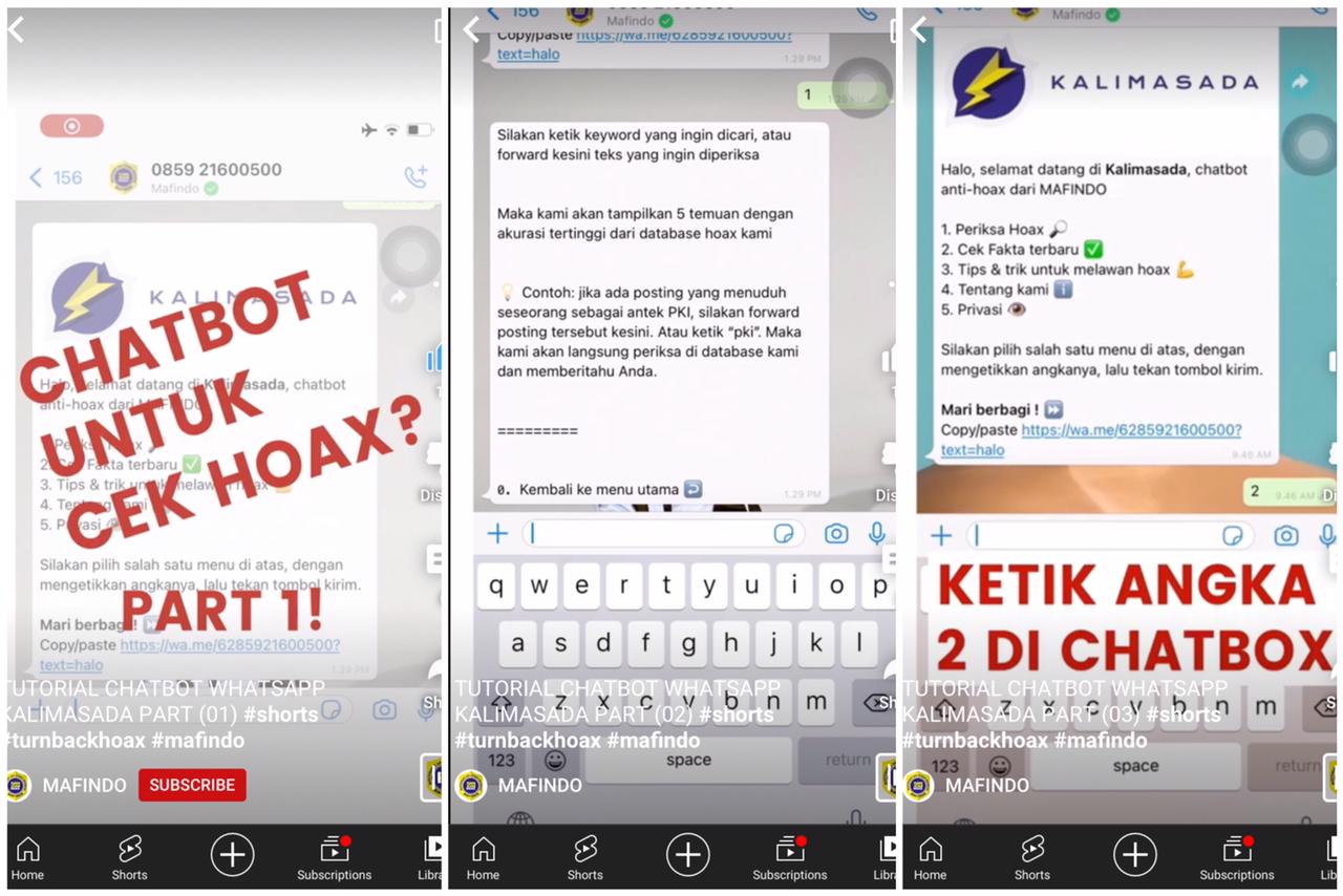 Lebih daripada itu, tim yang terdiri atas delapan mahasiswa gabungan dari Departemen Manajemen Bisnis ITS serta Statistika Bisnis ITS ini turut menggunakan Youtube Shorts untuk menyebarluaskan penggunaan Chatbot Kalimasada, sebuah layanan chat otomatis dengan beragam fitur penangkal hoaks buatan tim KKN ITS. Hanya dengan mengetikkan angka 1-3 melalui aplikasi Whatsapp, pengguna dapat memeriksa hoaks terkait topik tertentu, mengecek fakta terbaru, hingga tips dan trik untuk melawan hoaks.
