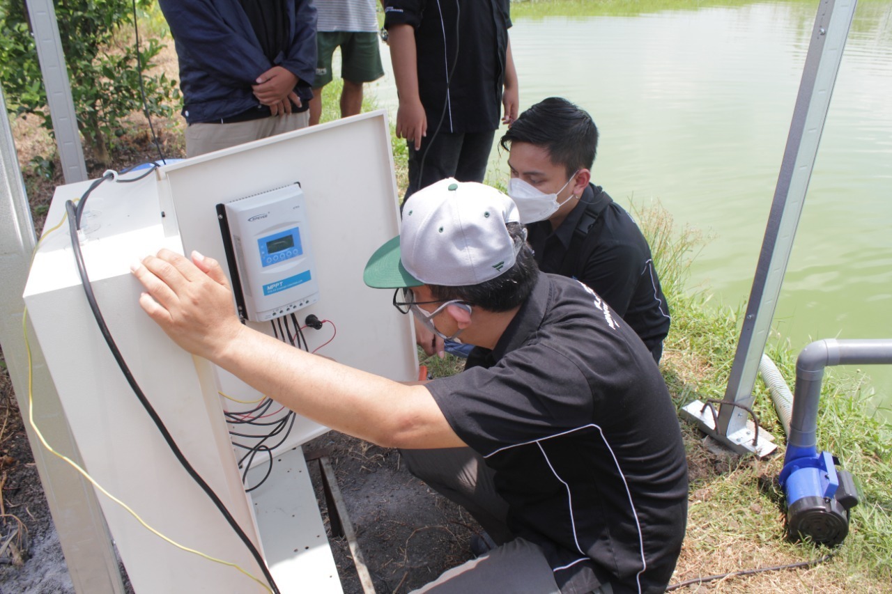 Ketua tim Abmas Dr Rony Seto Wibowo ST MT (bertopi) dan Penanggung Jawab Kegiatan Fahmi Riza Pahlevi melakukan pengecekkan kembali pada MPPT