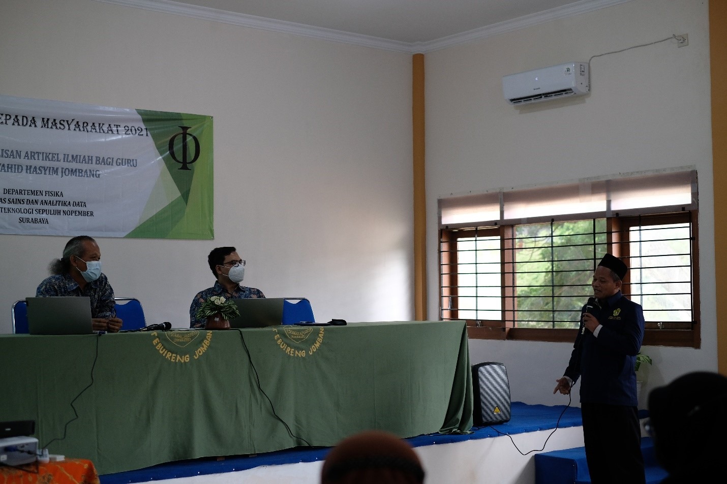 Jombang, ITS News – Peraturan Menteri Pendidikan Nasional Nomor 18 Tahun 2007 tentang sertifikasi guru dalam jabatan menyebutkan jika guru diharuskan mengembangkan profesinya dengan menuliskan artikel ilmiah. Untuk itu, tim Pengabdian kepada Masyarakat (Abmas) Departemen Fisika Institut Teknologi Sepuluh Nopember (ITS) menggelar pelatihan penulisan artikel ilmiah untuk meningkatkan kemampuan guru Sekolah Menengah Atas (SMA) A Wahid Hasyim, Jombang.