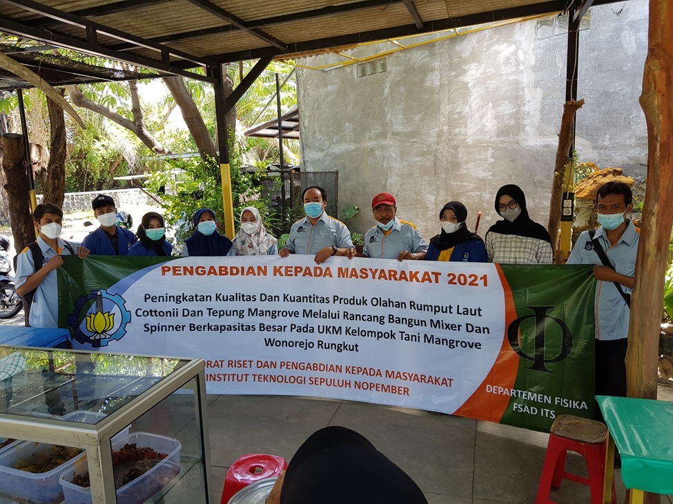 Kampus ITS, ITS News – Melimpahnya bahan baku rumput laut di pesisir Surabaya yang tidak terolah perlu adanya perhatian khusus. Oleh karena itu, tim Pengabdian kepada Masyarakat (Abmas) Departemen Fisika Institut Teknologi Sepuluh Nopember (ITS) melakukan pembuatan mixer dan spinner untuk meningkatkan kualitas dan kuantitas produk olahan rumput laut Cottonii UKM Kelompok Tani Mangrove Wonorejo Rungkut, Surabaya.