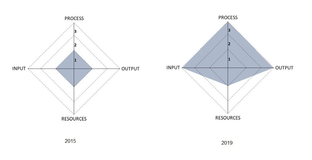 Diagram tingkat kepercayaan pada proses bisnis GoFood di tahun 2015 (kiri) dan tingkat kepercayaan GoFood tahun 2019 (kanan) berdasarkan Trust Aware Process Design Meta-model.