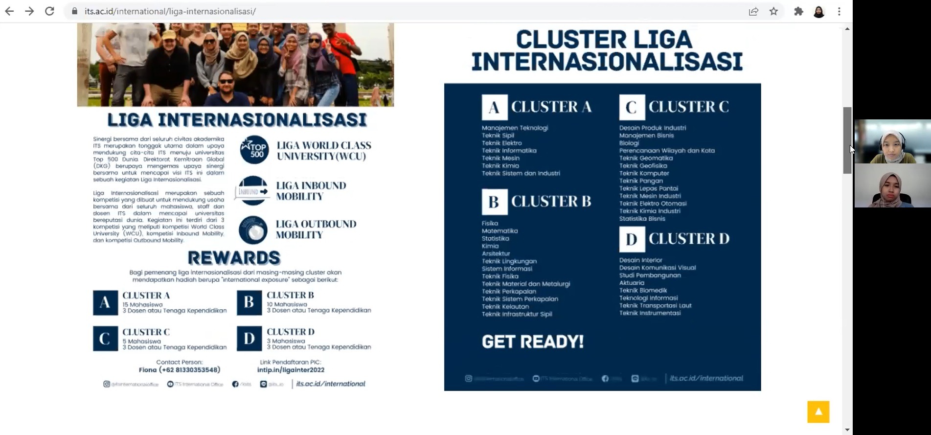 Faiqoh melanjutkan, sementara pada Liga Inbound Mobility, akan dilakukan asesmen terhadap partisipasi departemen dalam inisiasi dan implementasi kerja sama dengan mitra ke kancah global. ”Utamanya yaitu dengan mengundang akademisi dunia dan mahasiswa internasional untuk beraktivitas di departemen tersebut,” imbuh perempuan lulusan Departemen Desain Produk ITS.