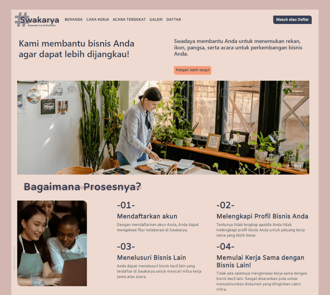 Ia mengungkapkan bahwa para pelaku UMKM dapat mendaftarkan bisnisnya dan saling terhubung melalui acara di laman web Swakarya. Platform ini sendiri hingga saat ini masih terdiri dari fitur buat akun, buat acaram dan ikut acara. UMKM yang ada dapat memanfaatkan Swakarya untuk membuat acara baru atau bergabung dengan acara UMKM lain. “Dalam acara itu, mereka bisa saling mengenal hingga menjalin kerjasama,” tuturnya.