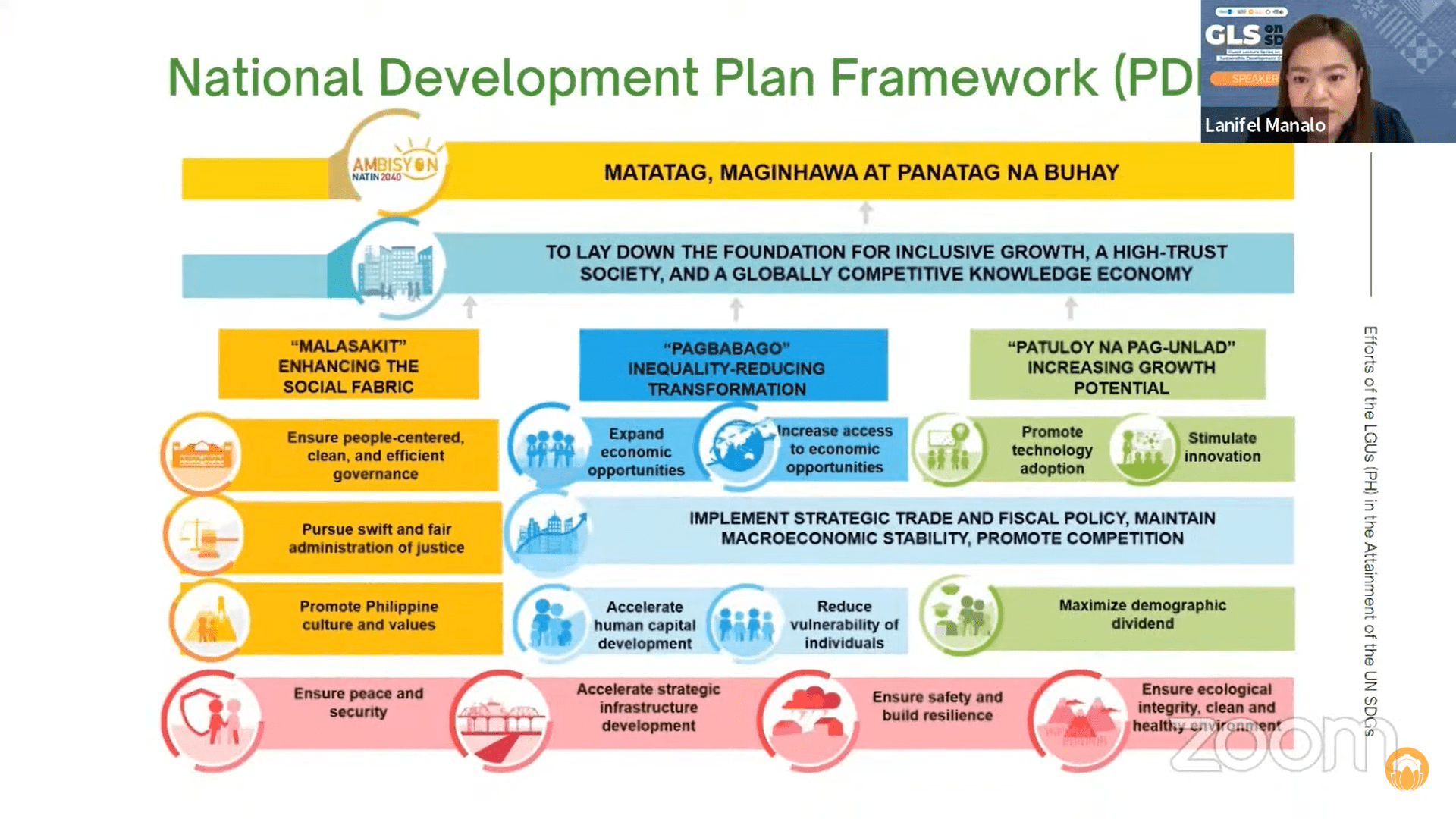Lanifel Cortez Manalo menjelaskan bahwa pemerintah Filipina memiliki Executive Order No. 27 yang berisikan perintah kepada pemerintah daerahnya untuk mengimplementasikan Philippine Development Program (PDP) 2017-2022. Terdapat tiga aspek yang ingin dicapai dalam PDP, yaitu malasakit (keprihatinan), pagbabago (pembaruan), dan patuloy na pag-unlad (progres yang berkelanjutan). “Tujuan utamanya adalah agar masyarakat memiliki kehidupan yang menetap, nyaman, dan terjamin,” ungkapnya.