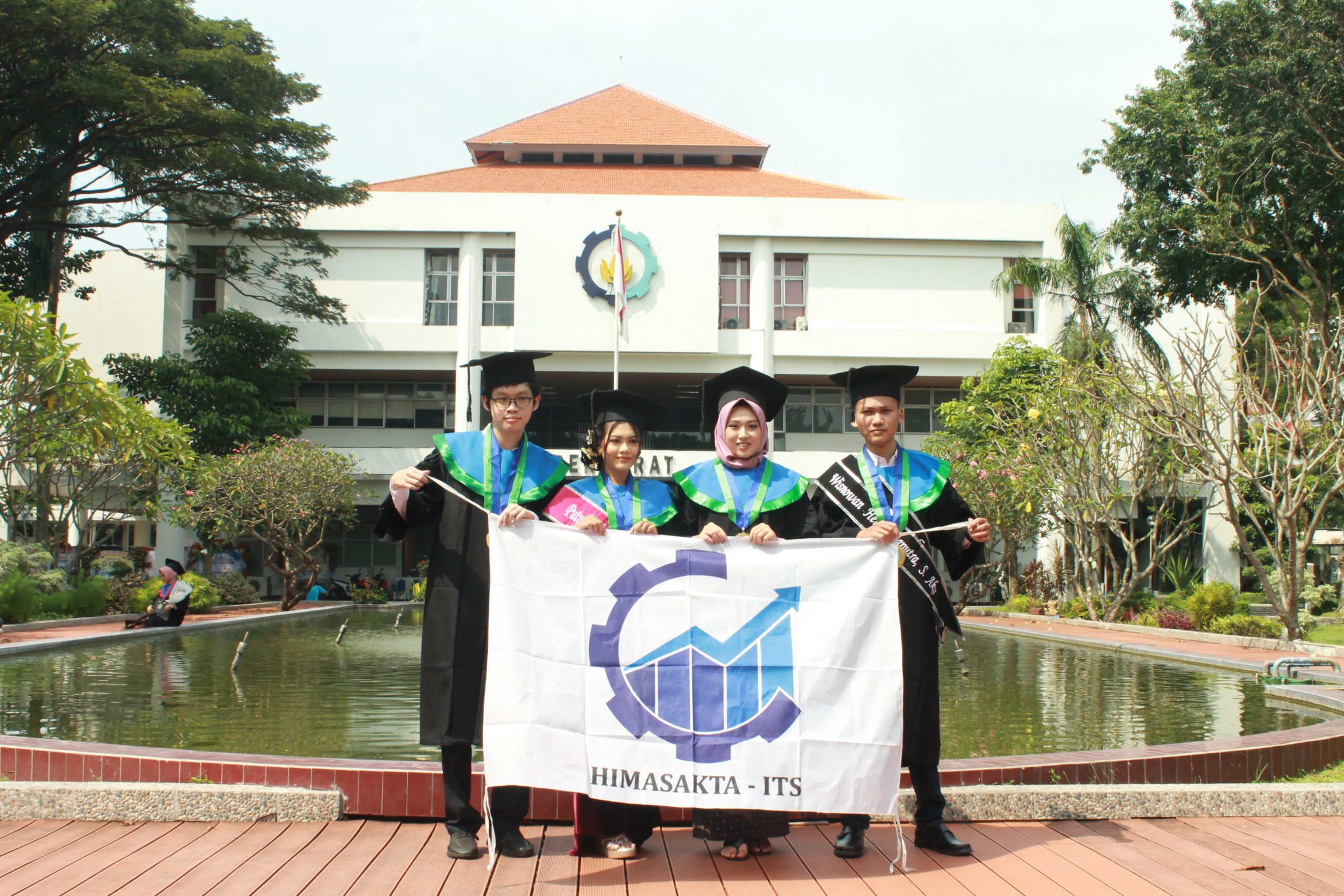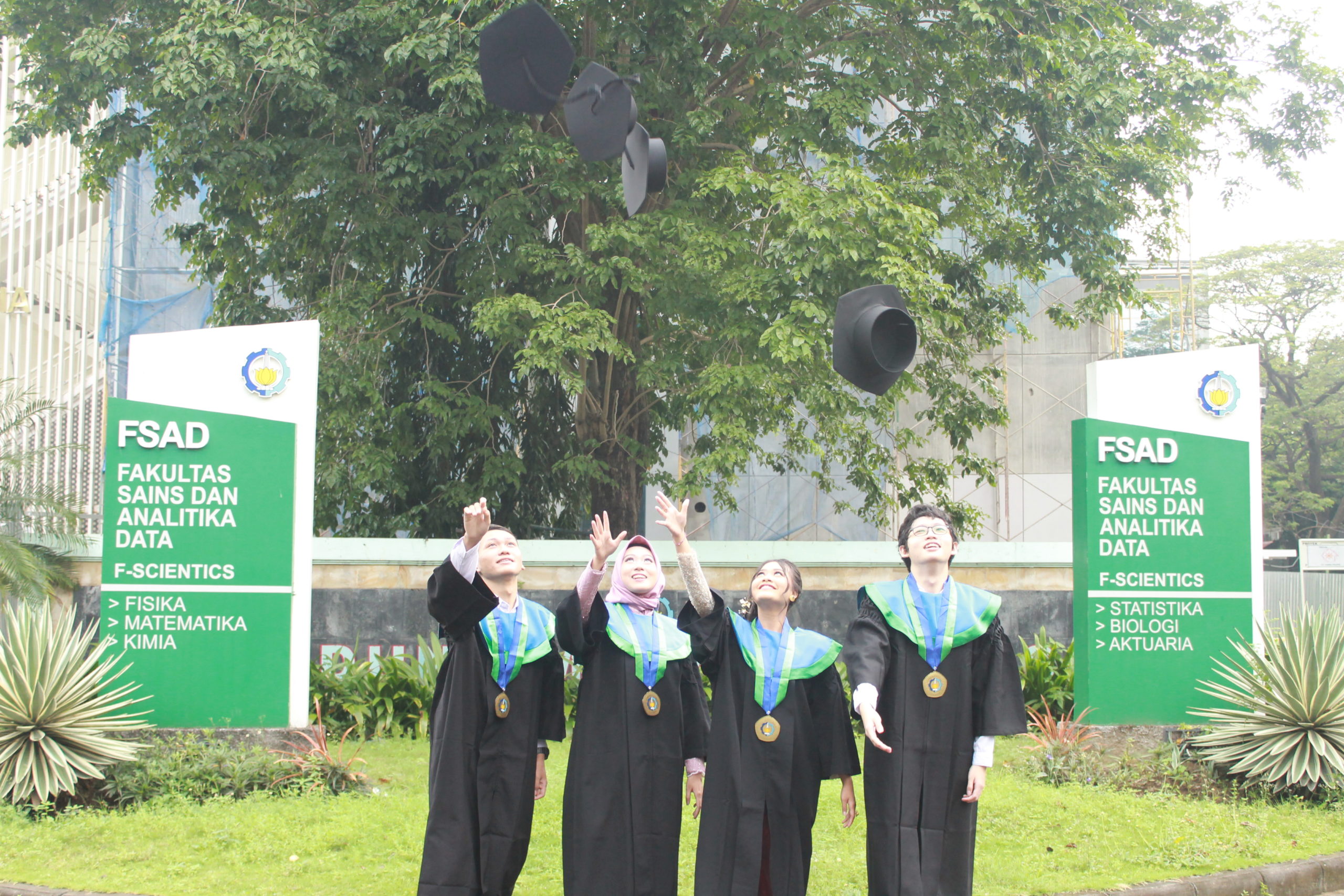 Keempat wisudawan angkatan pertama Departemen Aktuaria ITS di depan Menara Sains, Sabtu (26/3)