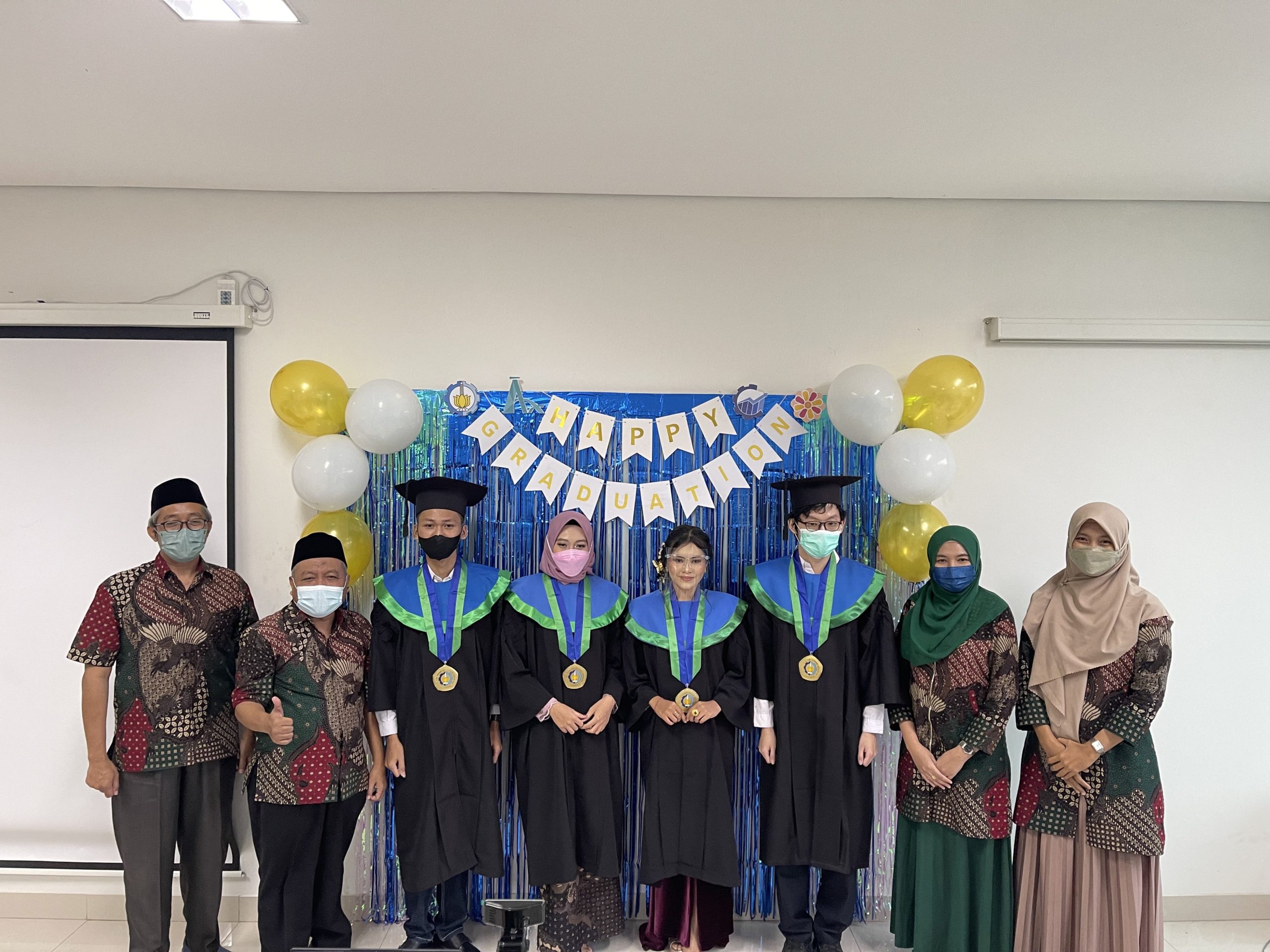 (dari kiri) R Muhammad Atok SSi MSi PhD, Dr Drs Soehardjoepri MSi , Wisnowan Hendy Saputra, Inneke Utami, Putu Maharani Anggun Ningtyas, Aldo Pradipta, Pratnya Paramitha Oktaviana SSi MSi, dan Ulil Azmi SSi MSi saat perayaan wisuda